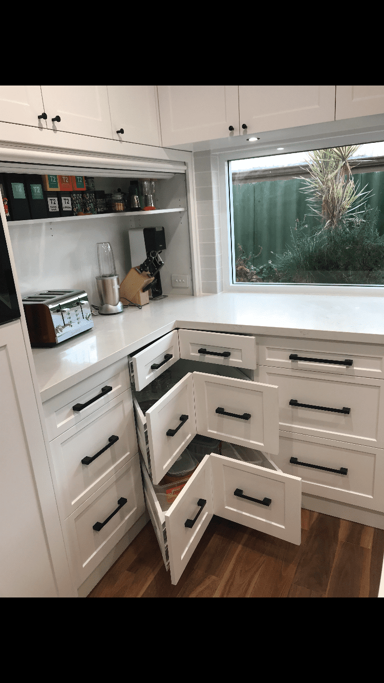 Cabinetry space – with the way we build cabinets these days your kitchen designer will create more space even if you follow the same layout as your existing kitchen. Why do you ask? Because of our drawer systems, we maximise the space in your cabinetry by using all the dead space towards the back of the cabinet (you know the items you just can’t get to) and even up to the top of the cabinet.
